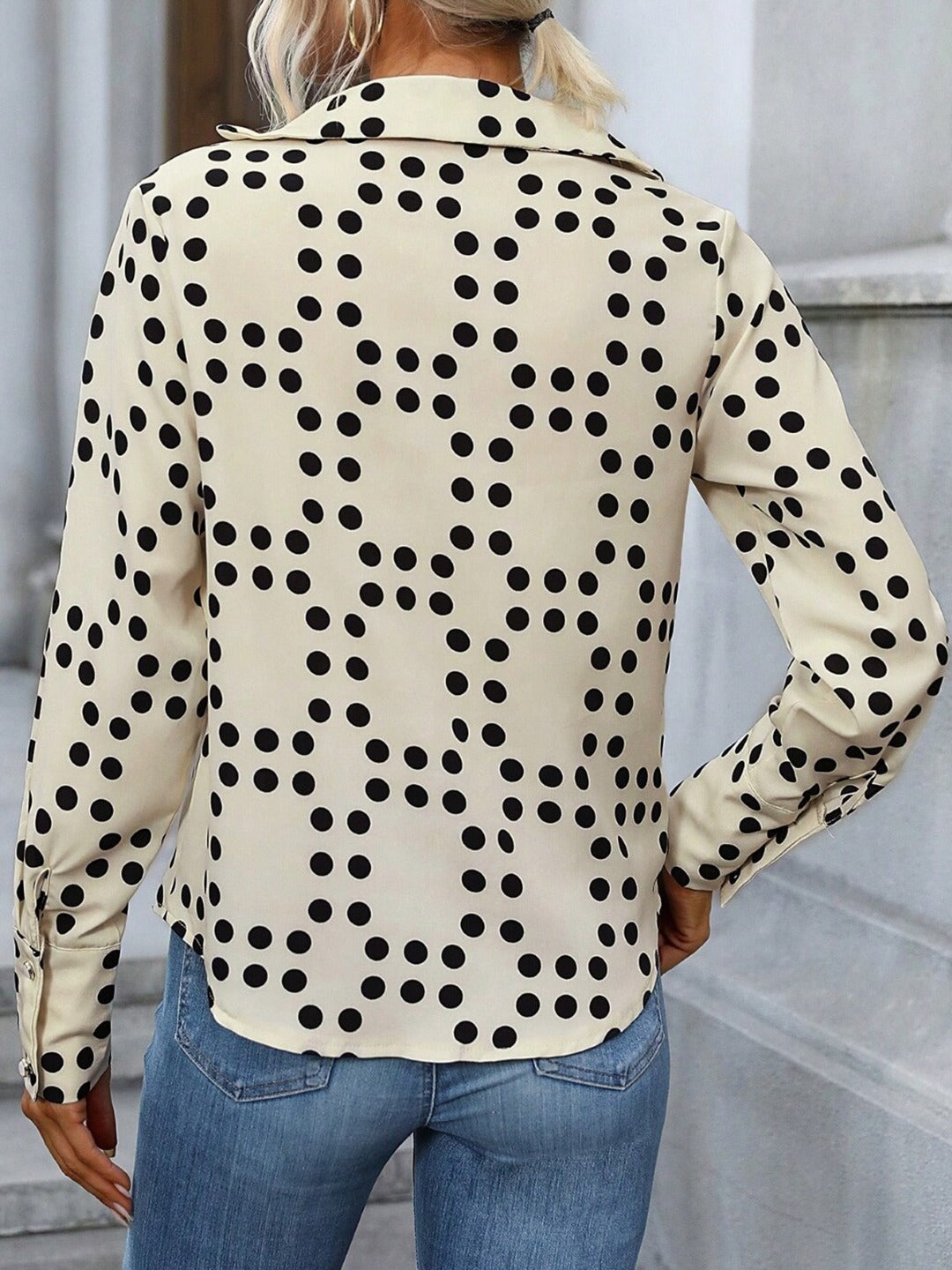 Our Classic cream polka dots v-neck long sleeves polyester top is a wardrobe staple every woman needs. The crisp Polyester fabric and tailored fit provide a polished look that easily transitions from work to weekend.