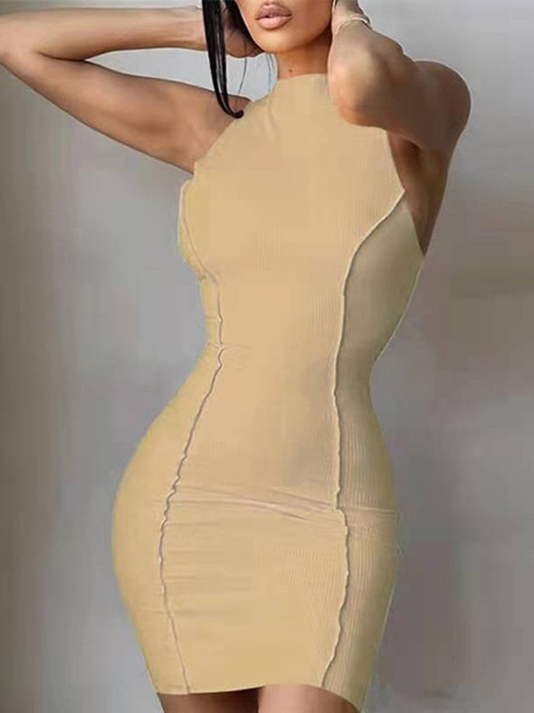 Cream Round Neck Bodycon Sleeveless Solid Above Knee Polyester Dress