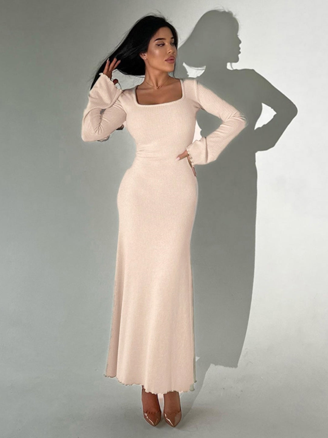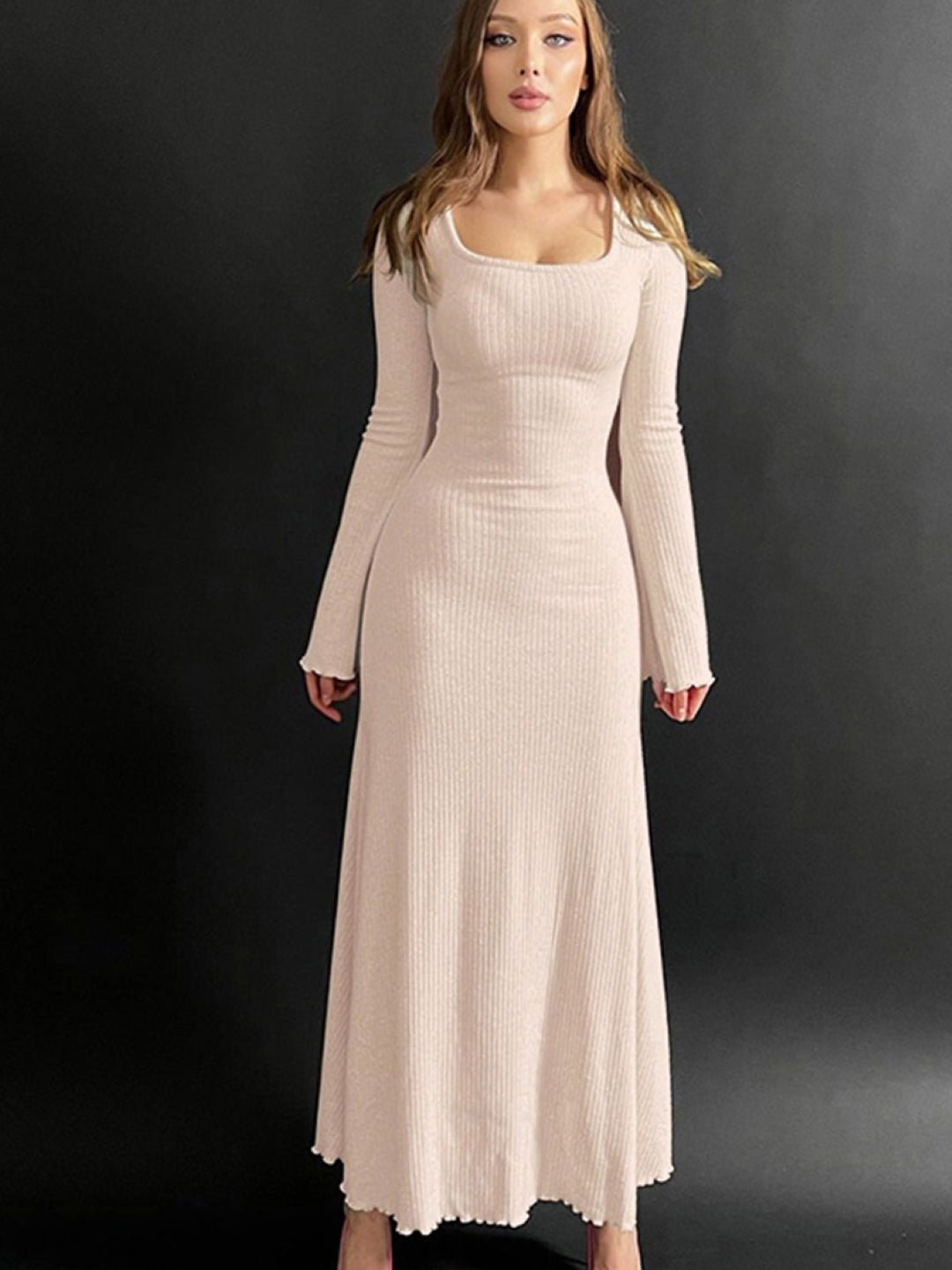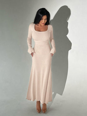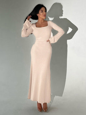 This elegant cream maxi dress features a classic round neck and long sleeves, making it a versatile and timeless addition to any wardrobe.