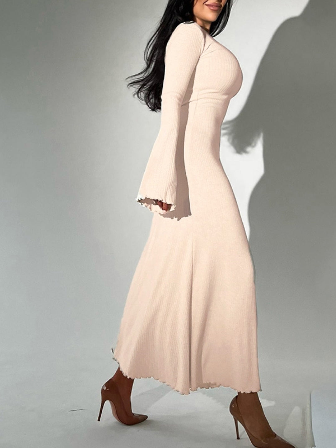 Cream Round Neck Long Sleeves Solid Polyester A-Line Dress