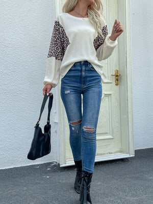 Cream Round Neck Printed Long Sleeves Polyester Top