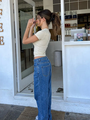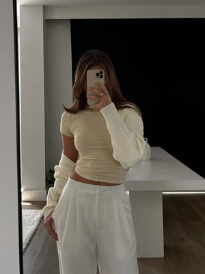 Cream Round Neck Short Sleeves Solid Polyester Top