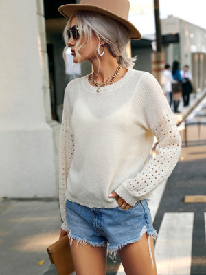 Cream Round Neck Solid Long Sleeves Polyester Sweater