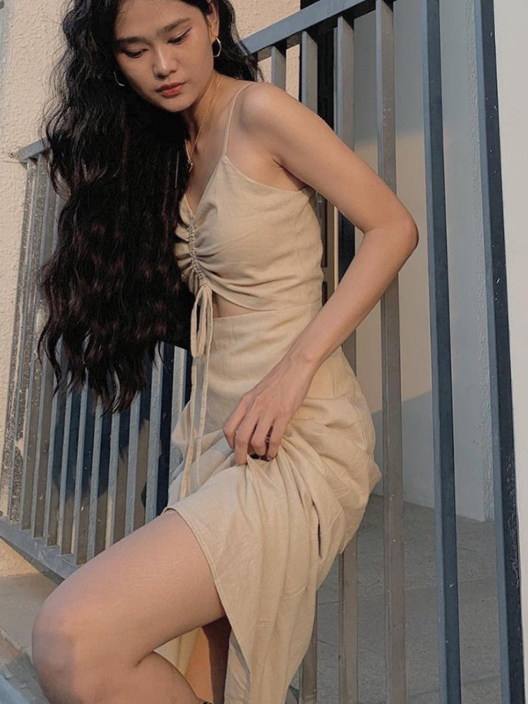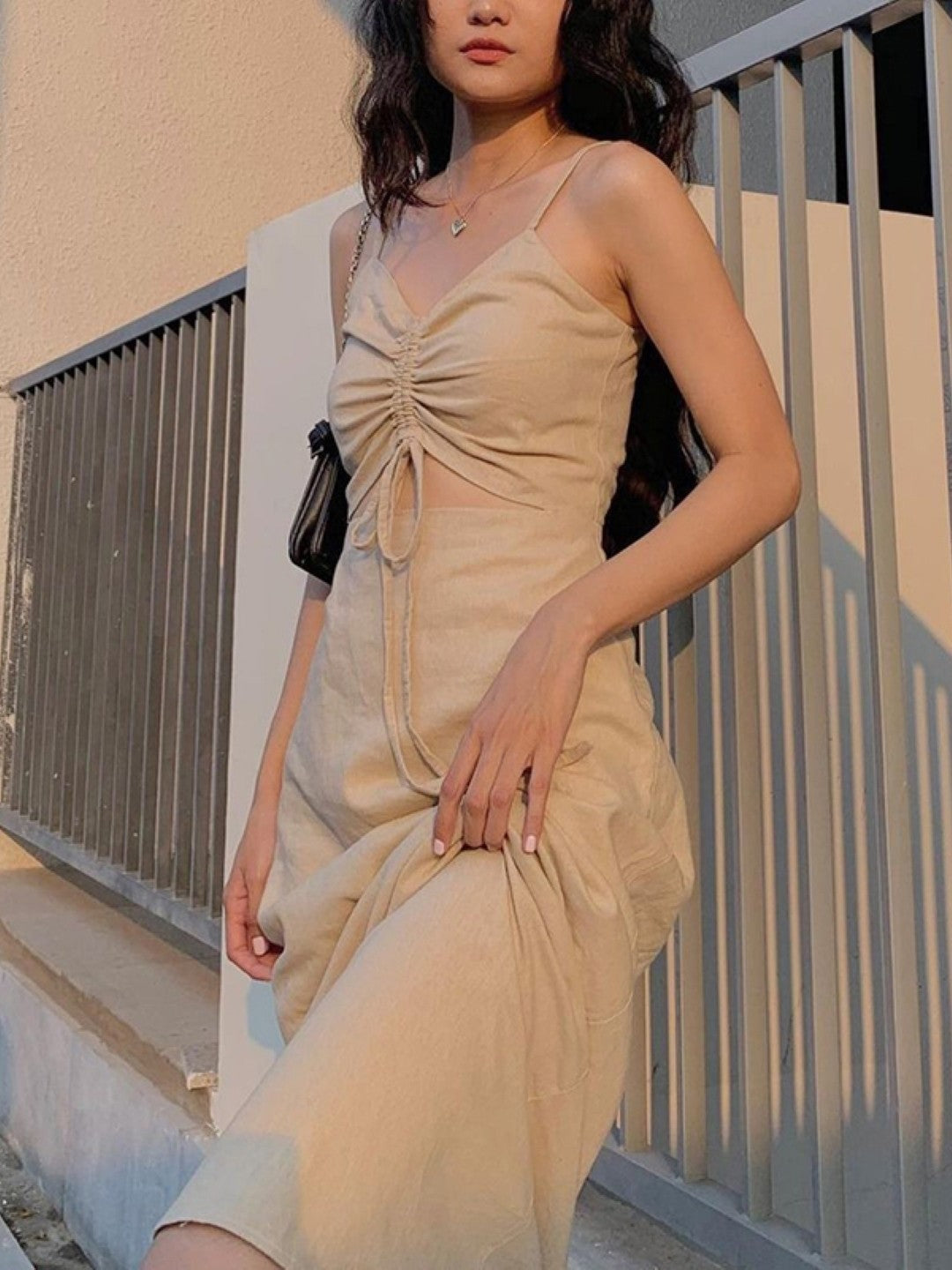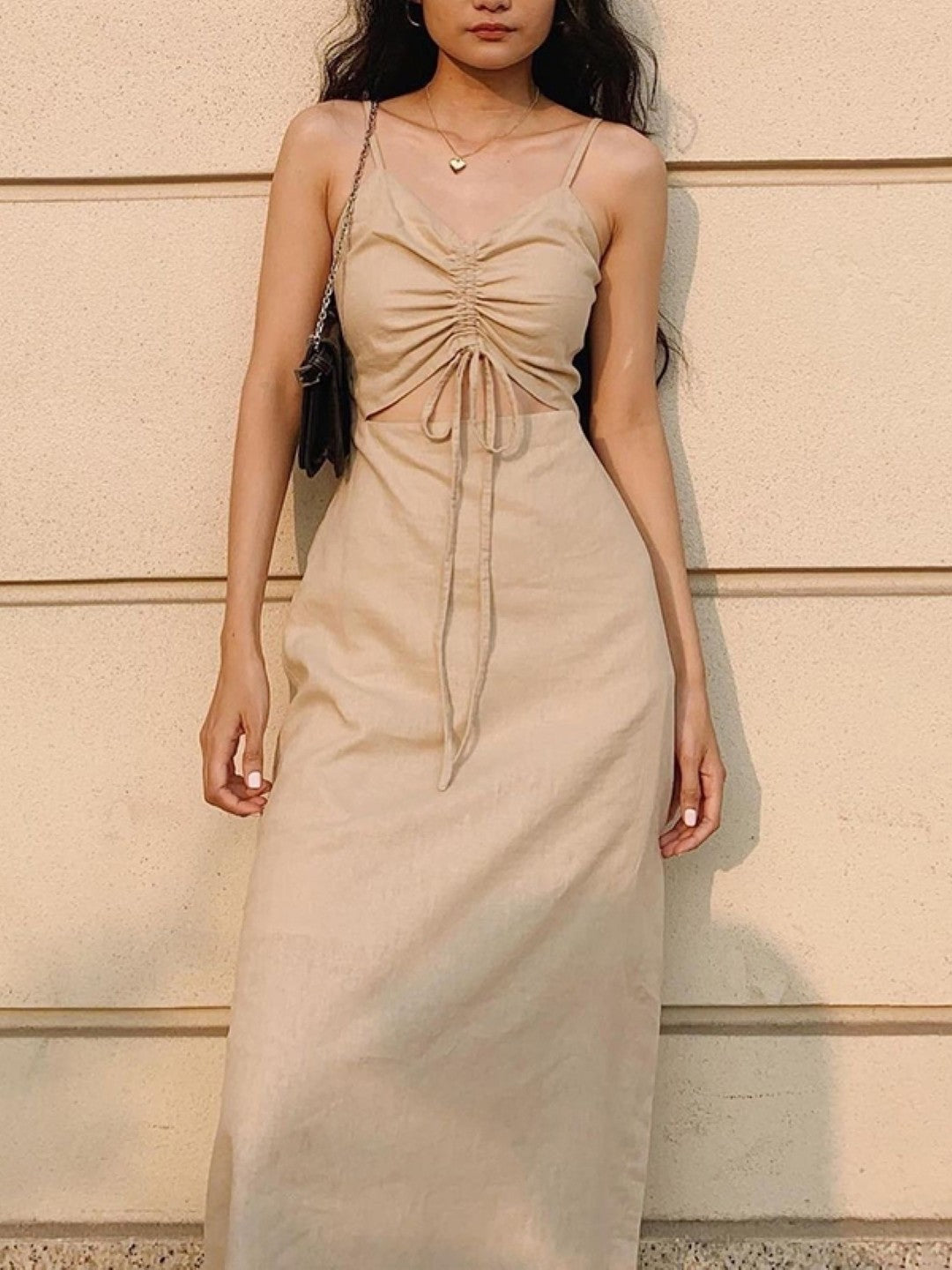 Cream Shoulder Strap Sleeveless Solid Polyester Bodycon Dress
