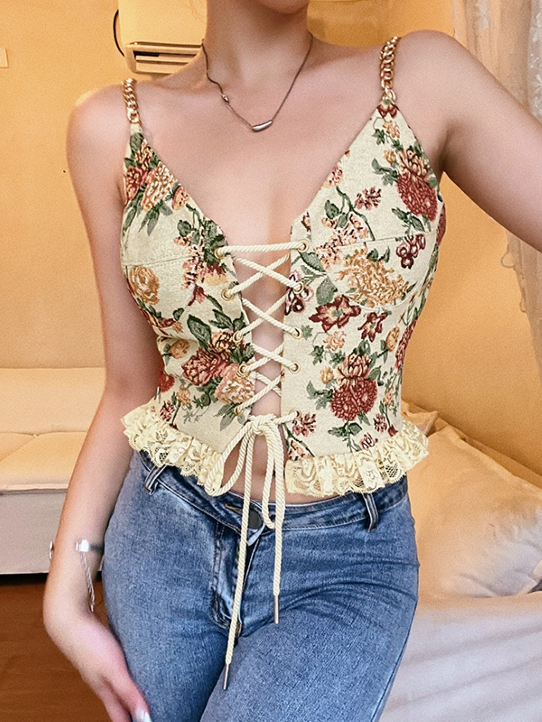 Cream Shoulder Straps Printed Sleeveless Polyester Top