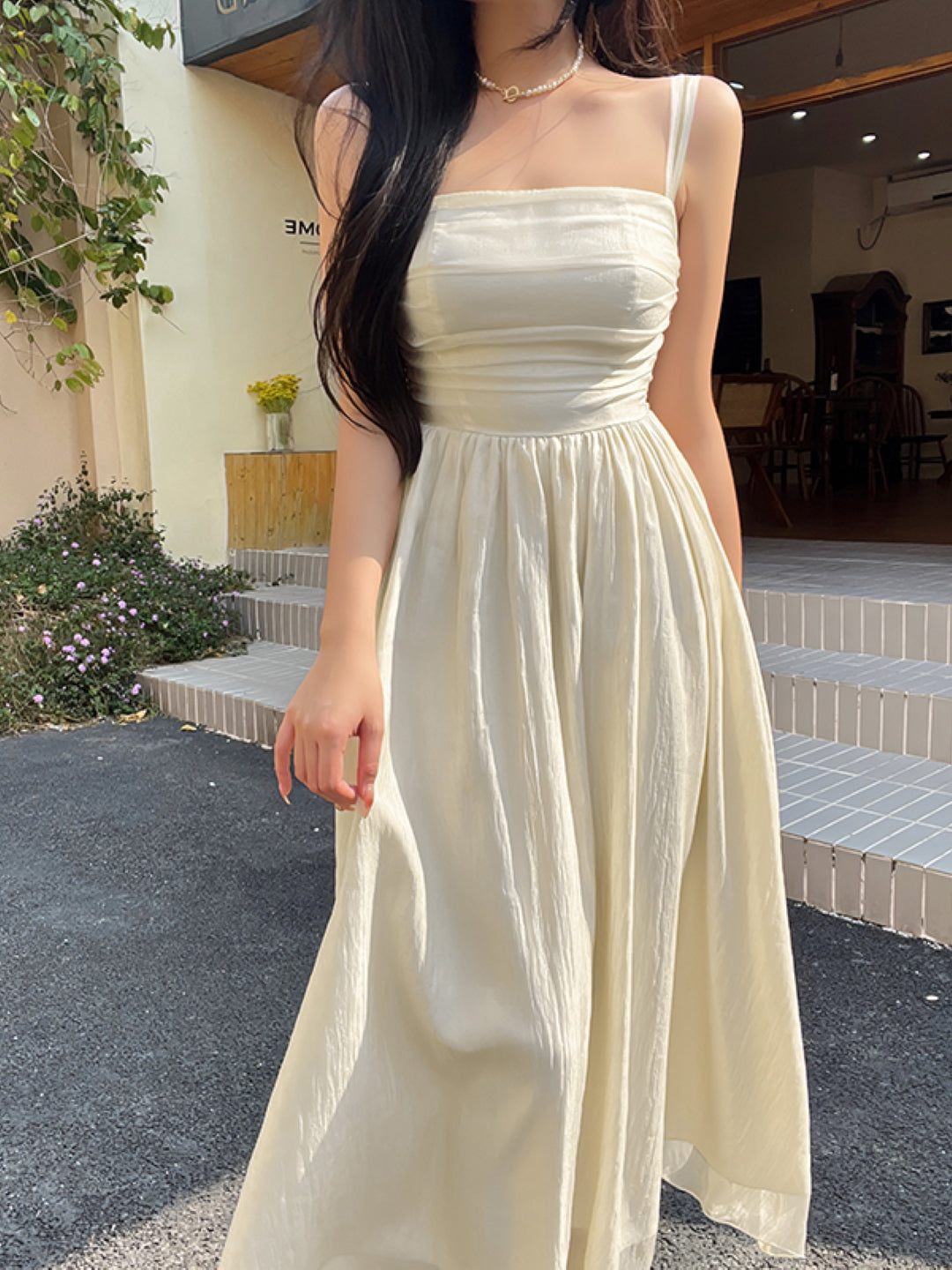 Cream Shoulder Straps Solid Sleeveless Maxi A-Line Polyester Dress