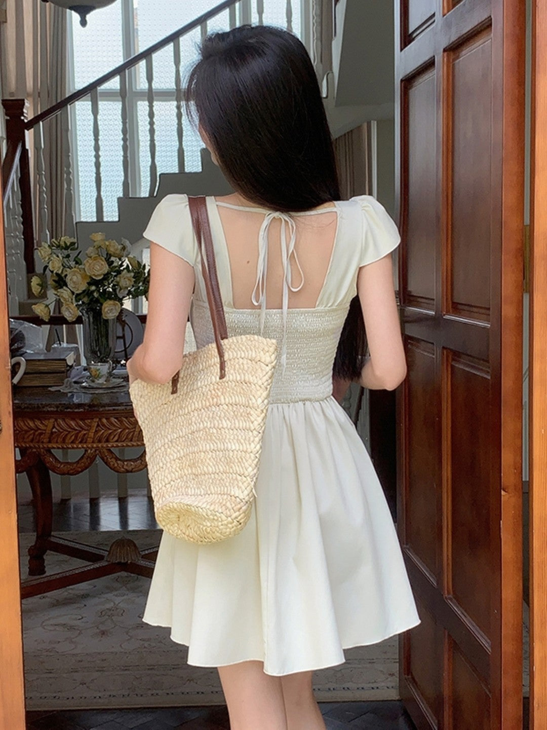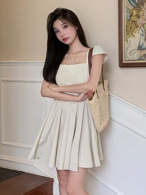 Cream Square Neck Short Sleeves Solid Polyester Bodycon Dress