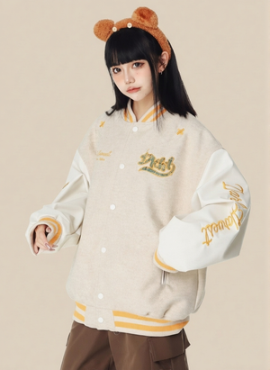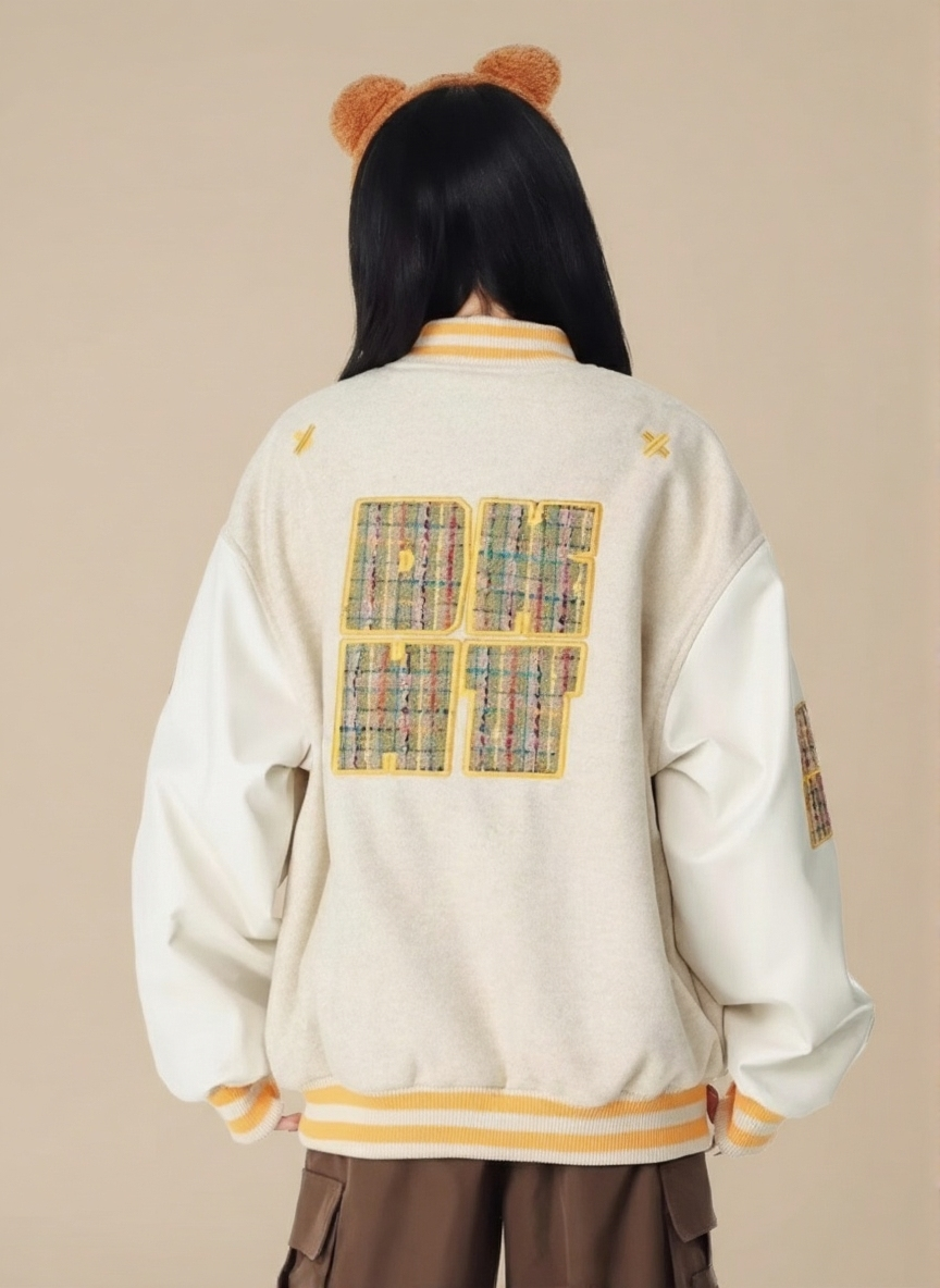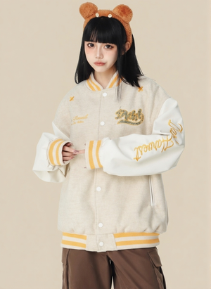 Cream Stand Collar Long Sleeves Printed Polyester Open Front Jacket