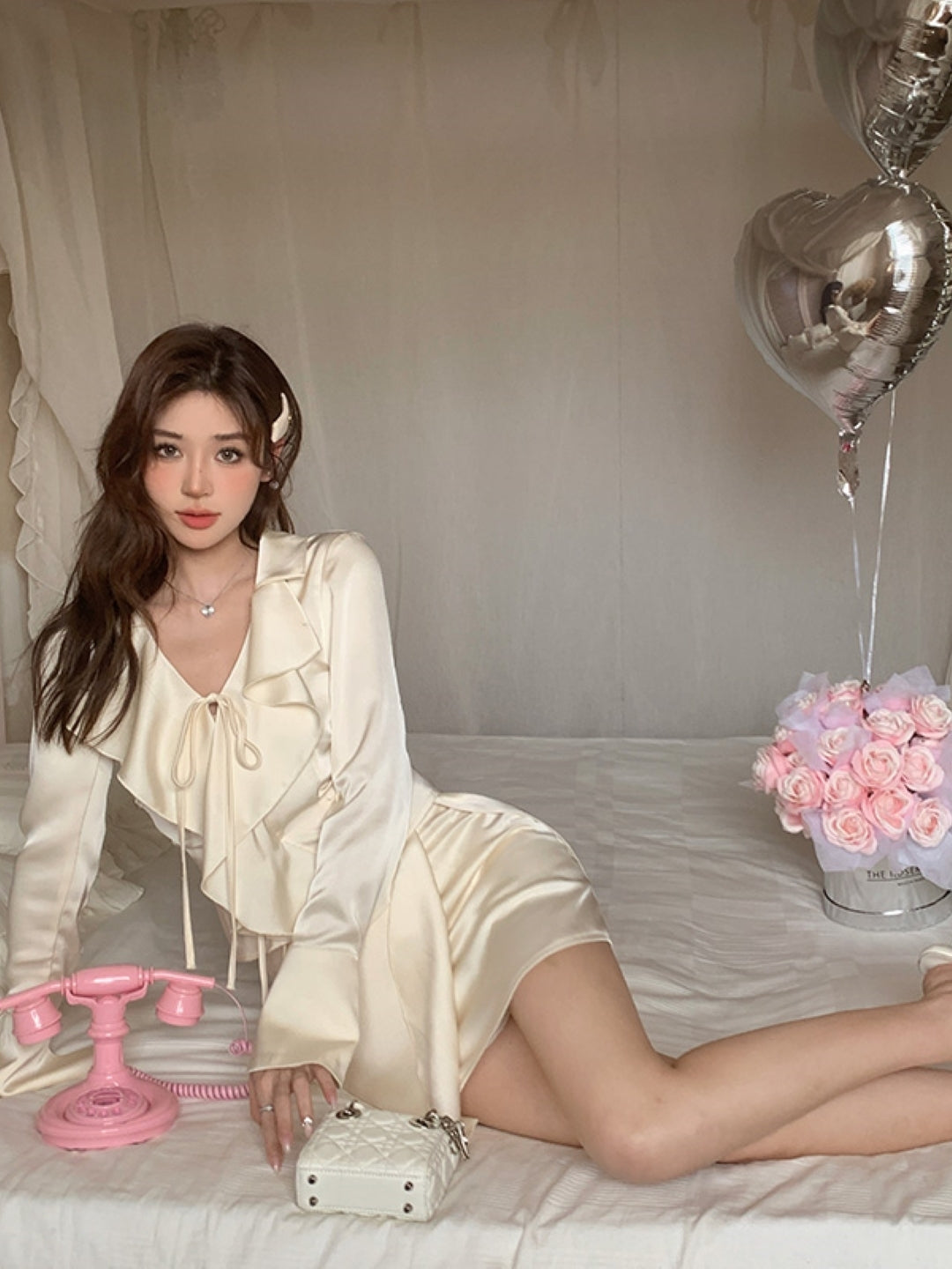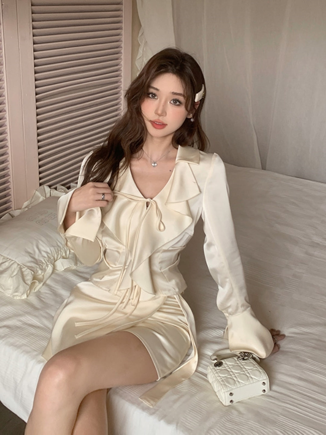 Cream V-Neck Long Sleeves Top & Skirt Set