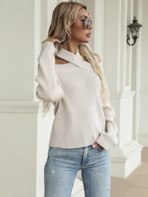 Cream V-Neck Solid Long Sleeves Polyester Top
