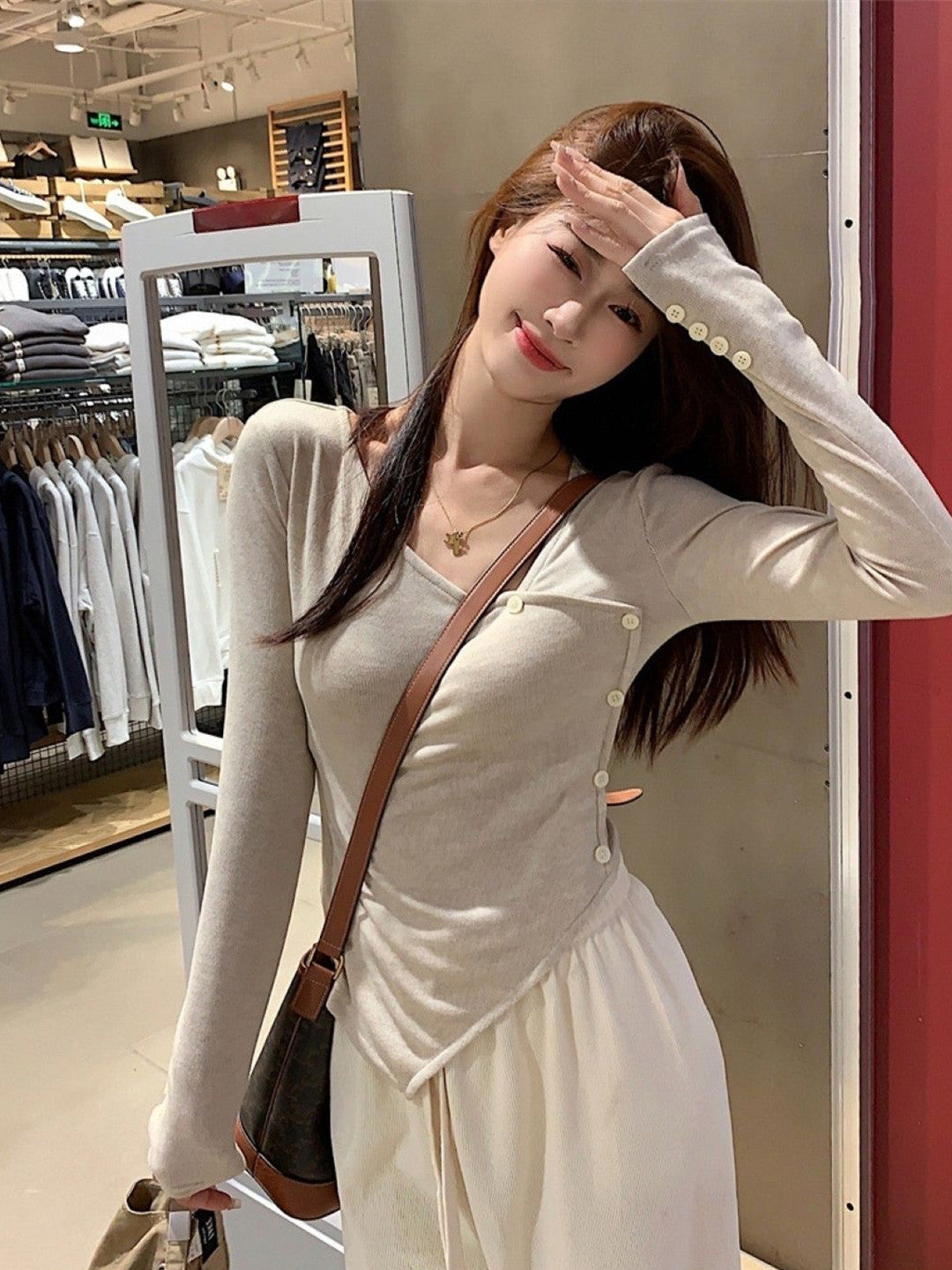 Cream V-Neck Solid Long Sleeves Viscose Rayon Pullover Sweater