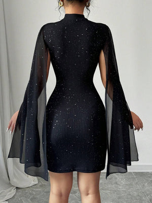 Elegant Black Cape Mini Dress ?Glitter Detail
