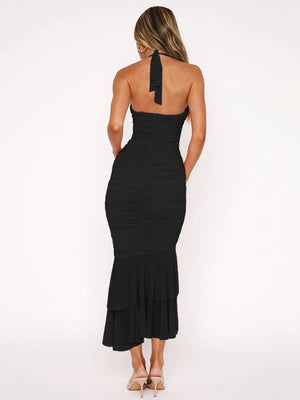 black dress, mermaid dress, midi dress, halter neck, evening dress, party dress, formal dress, elegant dress, ruched dress, layered hem