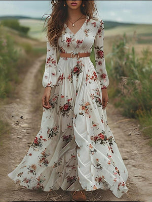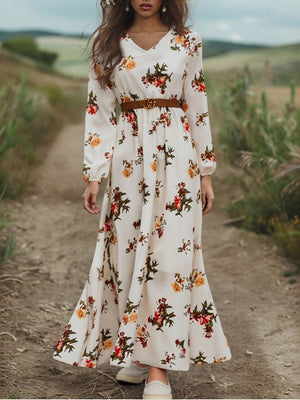 Step into effortless style with our Elegant Floral Long Sleeve Maxi Dress in White. Featuring a delicate floral print in warm tones of orange, red, and green, this dress is perfect for any occasion, from casual outings to garden parties. The lightweight fabric and flowing silhouette ensure comfort and grace, while the long sleeves and V-neckline add a touch of sophistication. Complete with a stylish brown belt to accentuate the waist, this maxi dress is a must-have for your wardrobe.