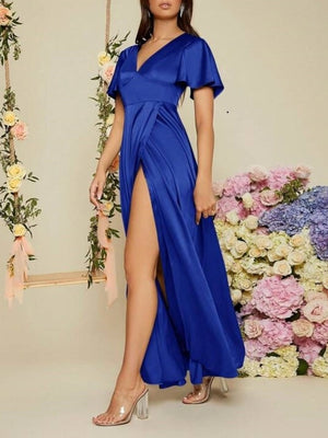 Make a statement in our Flutter Sleeve V-Neck Maxi Dress in a bold and beautiful royal blue shade. Designed with soft flutter sleeves, a flattering V-neckline, and a dramatic front slit, this dress exudes timeless elegance with a vibrant twist.