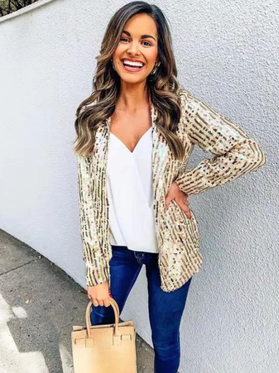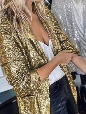 Gold Lapel Collar Solid Long Sleeves Polyester Jacket