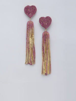 Introducing our exquisite Gold-Plated Pink Rhinestone Studded Heart Shaped Metallic Tassels, a perfect blend of elegance and sophistication. Crafted with precision, these earrings feature a stunning gold-plated finish that adds a touch of glamour to any outfit.