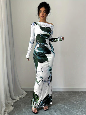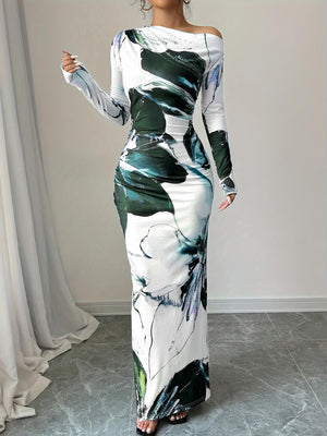 Command attention with the Green Abstract Print Bodycon Maxi Dress ?a bold blend of modern art and timeless elegance. Featuring a deep forest green and white abstract floral print, this form-fitting maxi dress flatters the figure with its sleek bodycon cut and off-shoulder neckline.Made from soft, stretchy fabric, it hugs your curves comfortably while offering a chic, polished silhouette. Ideal for evening occasions, cocktail parties, or any event where you want to turn heads with confidence and style.