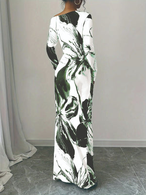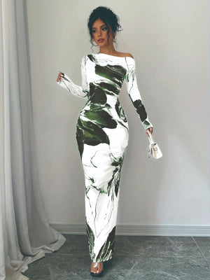 Elevate your evening look with the Green Abstract Floral Bodycon Maxi Dress. Showcasing a rich green and white palette with a striking abstract print, this dress features a flattering bodycon silhouette and off-shoulder neckline that effortlessly enhances your figure. Crafted from soft, stretchy fabric for a smooth, comfortable fit, this full-length dress is ideal for special occasions, evening events, or an elegant night out. The artistic floral print adds a modern twist to a timeless style.