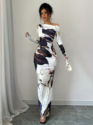 Elevate your evening look with the Green Abstract Floral Bodycon Maxi Dress. Showcasing a rich green and white palette with a striking abstract print, this dress features a flattering bodycon silhouette and off-shoulder neckline that effortlessly enhances your figure.Crafted from soft, stretchy fabric for a smooth, comfortable fit, this full-length dress is ideal for special occasions, evening events, or an elegant night out. The artistic floral print adds a modern twist to a timeless style.