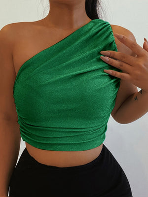 Green One Shoulder Sleeveless Polyester Top