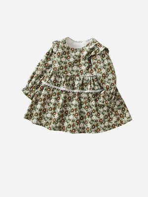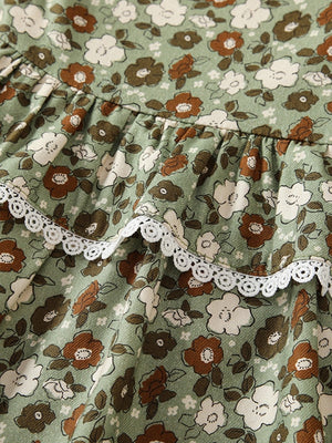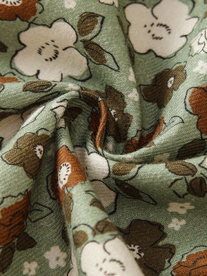Green Round Neck Casual A-Line Floral Long Sleeves Knee Length Cotton Dress