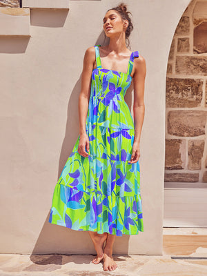 Embrace your feminine side and turn heads with our green square neck a-line floral sleeveless maxi polyester dress. Crafted from high-quality polyester, this dress offers a comfortable and lightweight feel, perfect for any occasion.