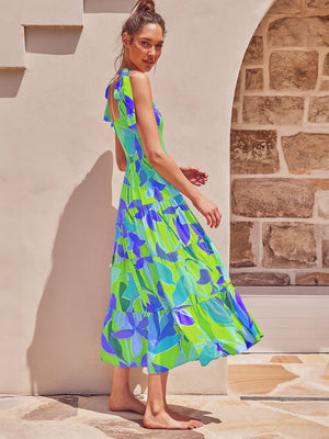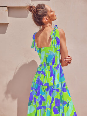 Green Square Neck A-Line Floral Sleeveless Maxi Polyester Dress
