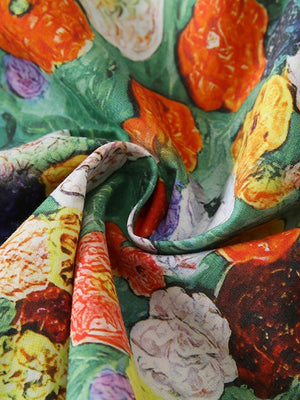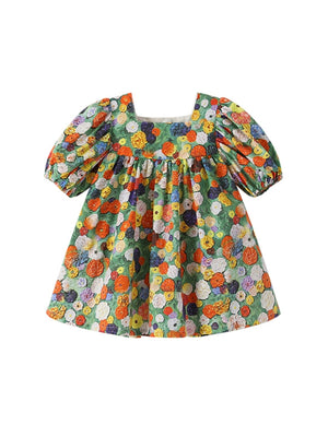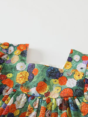 Green Square Neck Floral A-Line Short Sleeves Cotton Knee Length Dress