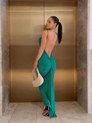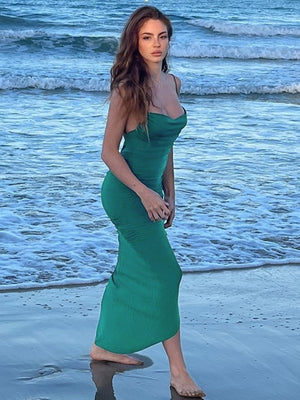 Turn heads with our Green Strappy Bodycon Maxi Dress, designed to enhance your natural shape with a sleek, figure-hugging fit. The minimalistic silhouette paired with delicate spaghetti straps creates a chic and modern look.