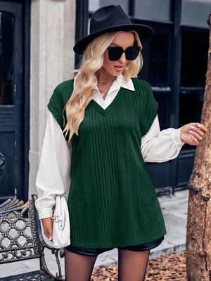 Introducing our Green V-Neck Polyester Sweater, a stylish and versatile addition to your wardrobe. Made from high-quality polyester fabric, this top offers a comfortable and breathable fit. The v-neck design adds a touch of elegance, while the black color provides a timeless and sophisticated look.