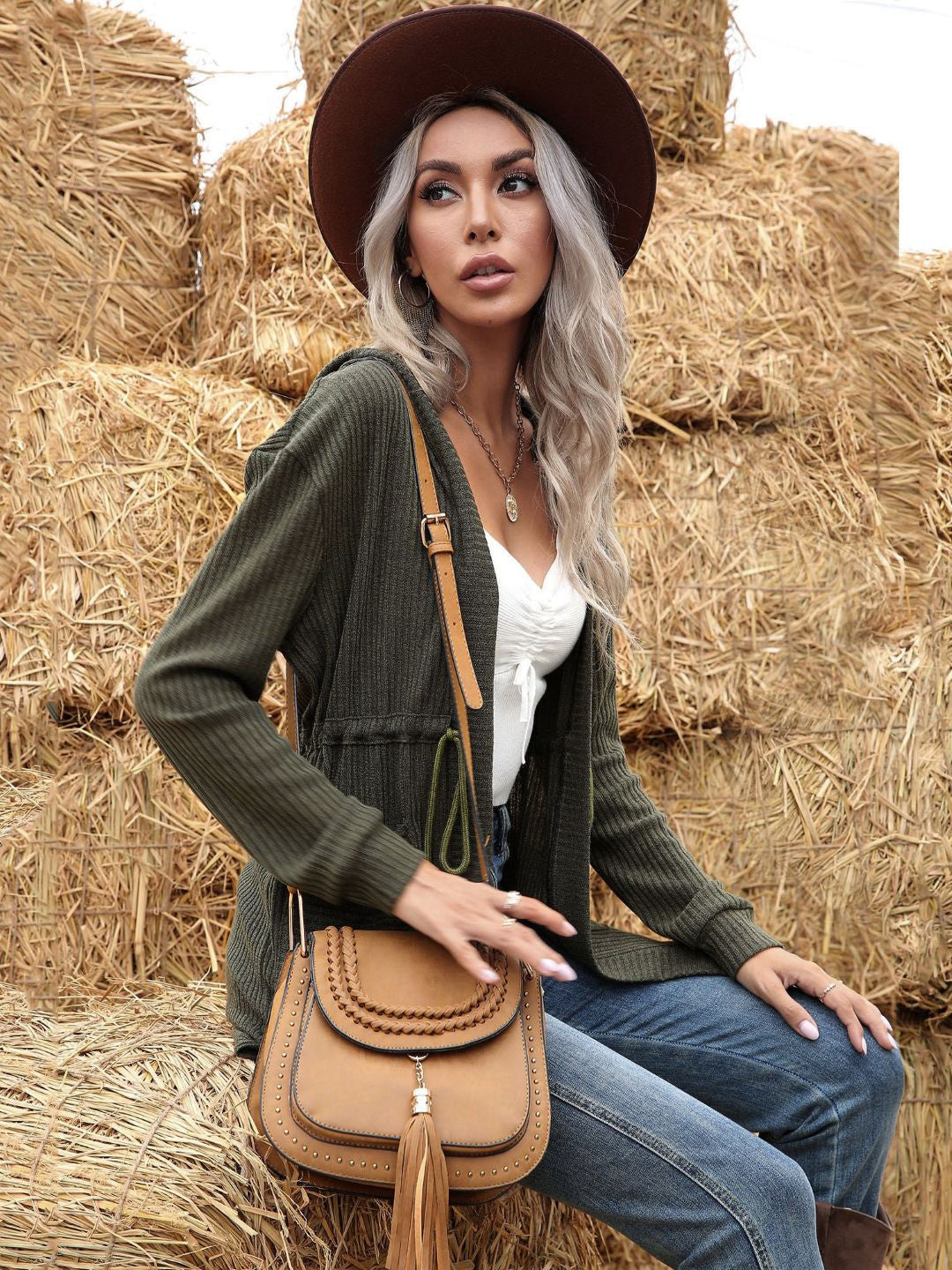 Green V-Neck Solid Long Sleeves Polyester Longline Cardigan Sweater