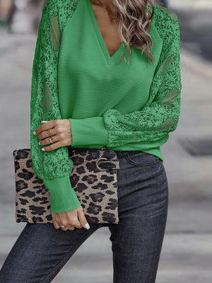 Green V-Neck Solid Long Sleeves Polyester Top