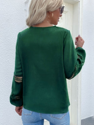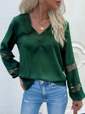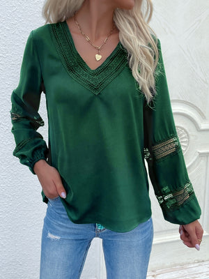 Green V-Neck Solid Long Sleeves Polyester Top
