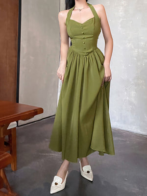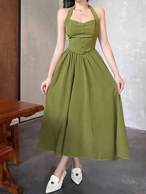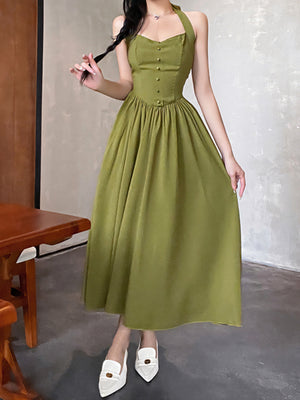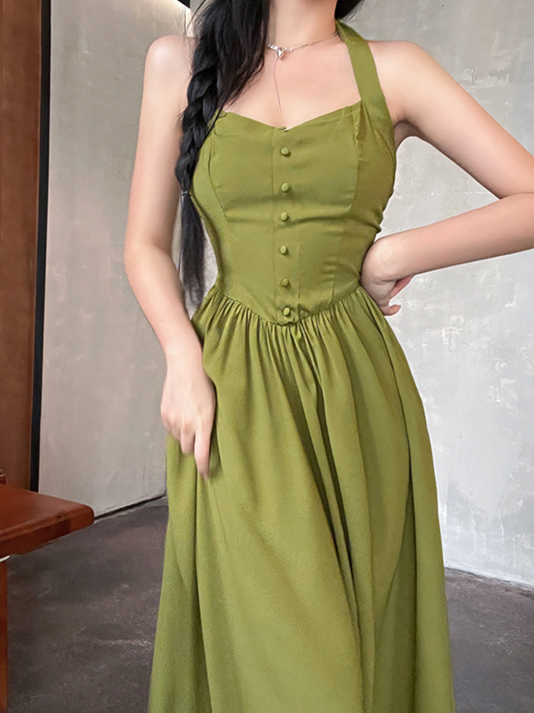 Green V-Neck Solid Sleeveless Maxi A-Line Polyester Dress