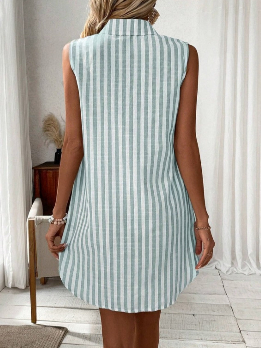Keep it fresh and breezy with our Green & White Striped Sleeveless Shirt Dress. Perfect for sunny days, this dress combines classic vertical stripes with a relaxed modern cut for an effortlessly chic style.