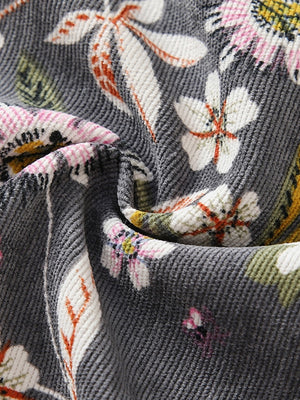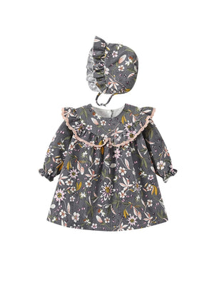 Grey A-Line Round Neck Floral Long Sleeves Cotton Dress