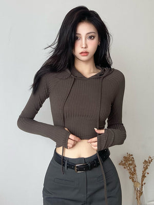 Grey Hood Long Sleeves Solid Polyester Top