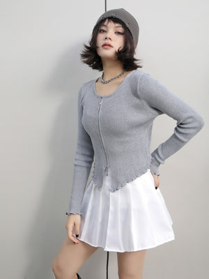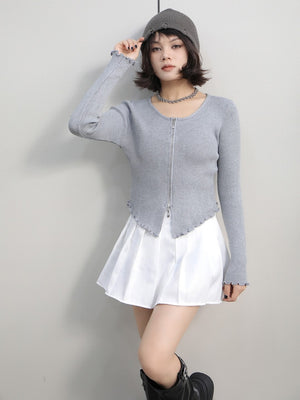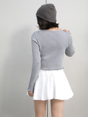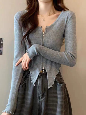 Grey Polyester V-Neck Long Sleeves Solid Top