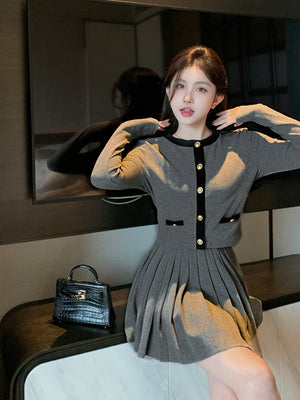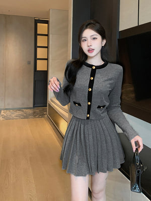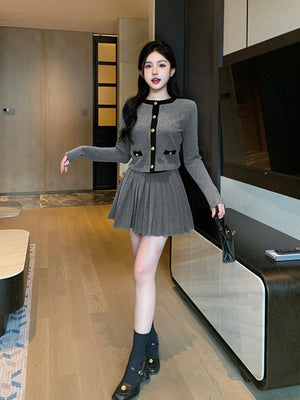 Grey Round Neck Long Sleeves Top & Skirt Set