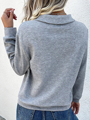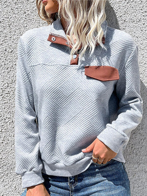 This cozy pullover sweatshirt features a unique quilted geometric pattern in a soft, light gray hue. The contrasting brown trim on the collar and chest pocket adds warmth and visual interest. With a high button-up collar and long sleeves, it's perfect for layering during cooler days or casual outings.