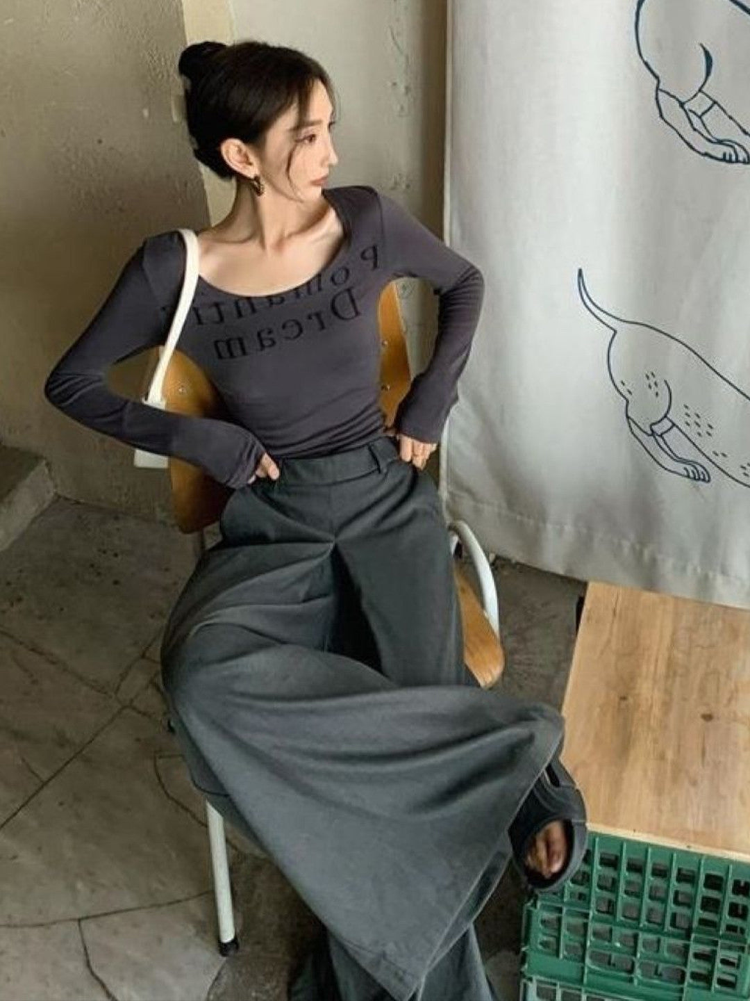 Grey Scoop Neck Long Sleeves Typography Polyester Top