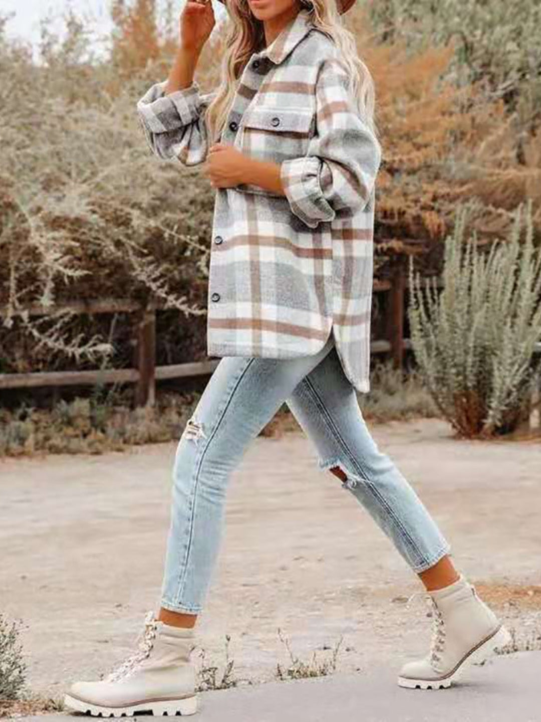 Grey Shirt Collar Three-Quarter Sleeves Checked Polyester Top