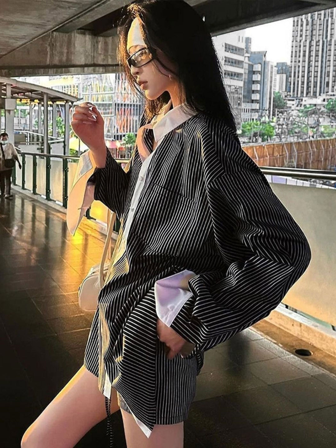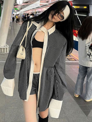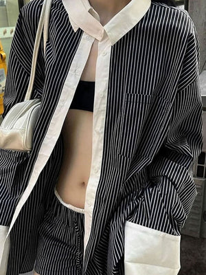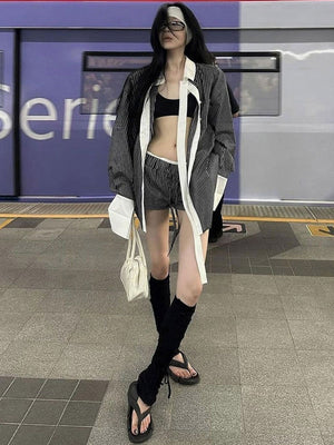 Grey Spread Collar Long Sleeves Striped Polyester NA