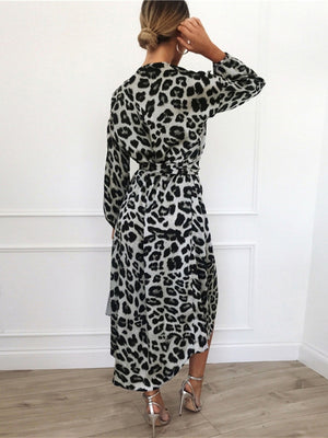 Grey V-Neck A-Line Long Sleeves Animal Maxi Polyester Dress