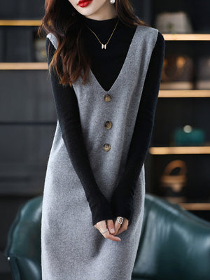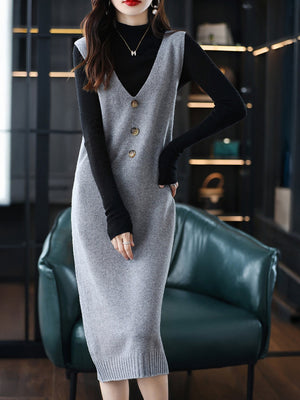 Grey V-Neck Solid Sleeveless Midi Sheath Acrylic Dress