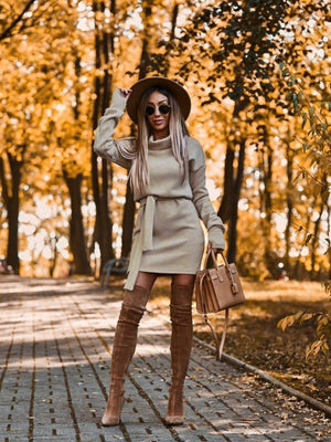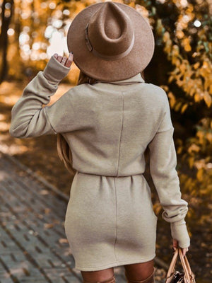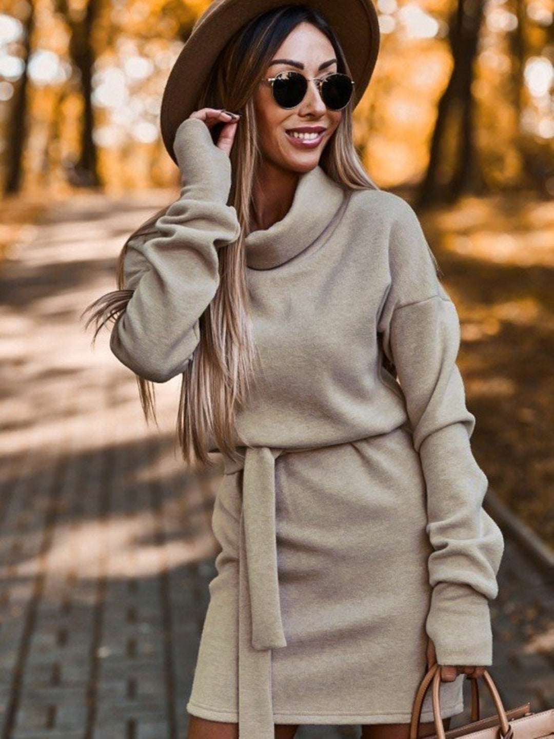 Khaki High Neck Solid Long Sleeves Fit and Flare Polyester Above Knee Dress