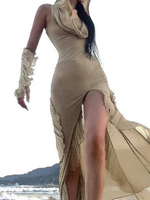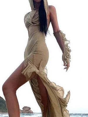 Khaki Hood Neck Sleeveless Solid Polyester Bodycon Side Slit Dress