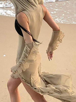 This Khaki Hood Neck Sleeveless Solid Polyester Bodycon Side Slit Dress is ideal for any special event. The elegant design and bodycon fit highlight your curves, with the details adding a touch of allure. Crafted from high-quality polyester fabric, this dress is both comfortable and chic.
