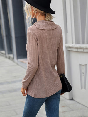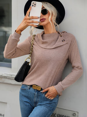 Khaki Round Neck Solid Long Sleeves Polyester Top